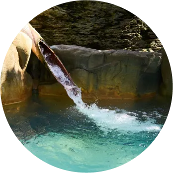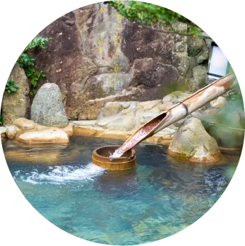 著名的下田温泉的温泉水未经加热、稀释或循环、是源泉挂流式温泉。利用充沛的泉水量、不进行加热和加水、随时都能享受优质的天然温泉。
